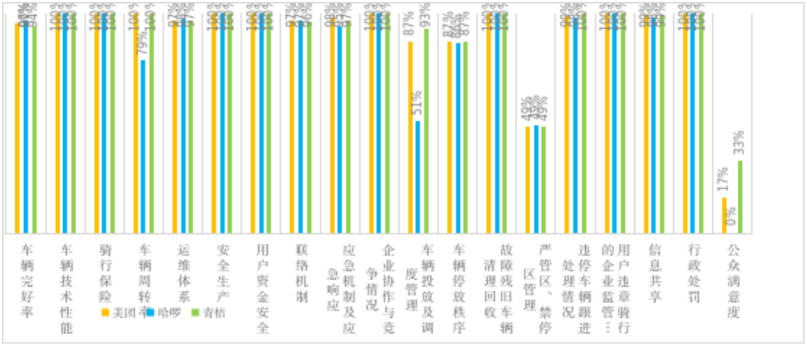 本次考核由市、区、街三级政府管理部门共同完成,包括市交通运输、城市管理综合执法、公安交管部门,以及中心六区(越秀区、海珠区、荔湾区、天河区、白云区、黄埔区)的属地区、街两级政府管理部门,共计有123个单位参与了本次考核评分。本次季度服务考核指标为六大类别共20项具体考核指标(不计奖惩项),满分为100分,分别从运营服务(17分)、企业管理(20分)、秩序管理(48分)、信息共享(9分)、行政处罚(3分)、公众满意度(3分)等方面对经营企业的管理服务能力进行全面考核。从考核结果看,三家企业的得分都超过了80分;在得分率方面(即单项得分占该项总分的比值),与上季度相同,有15项的指标得分率都高于80%;但“车辆投放及调度管理”“严管区禁停区管理”及“公众满意度”这三项指标的得分率仍较低。这说明三家单车企业仍需将提升现场秩序管理效果作为当前运维管理的重点和目标。
